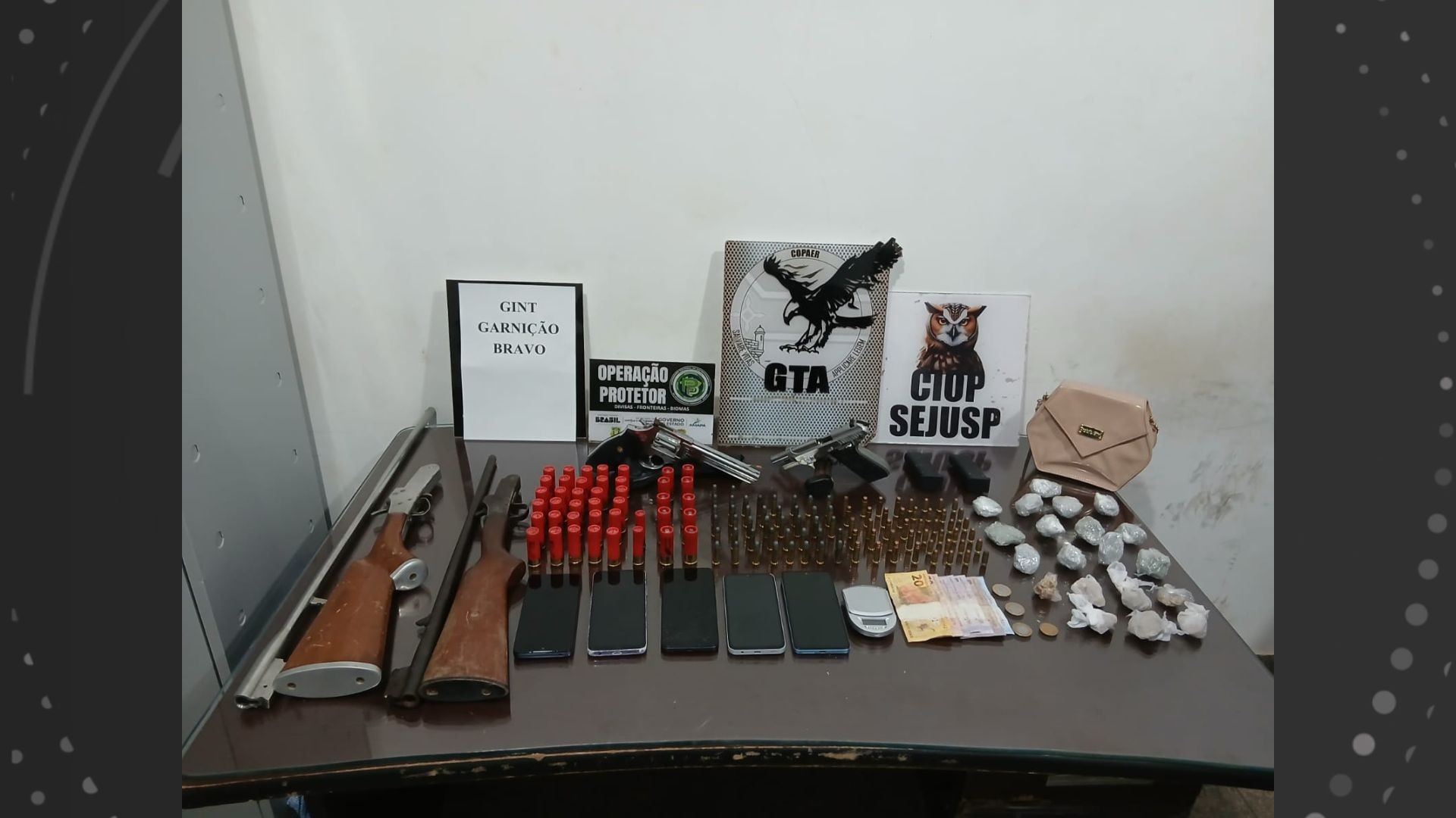 Em outro endereço, um adolescente foi apreendido com munições. No bairro Monte das Oliveiras, dois adultos e dois adolescentes foram detidos. No imóvel, a polícia apreendeu espingardas, munições, drogas, uma balança de precisão e um revólver calibre 38.