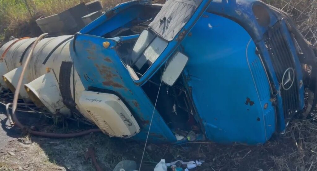 Caminhão carregado com abudo líquido tomba no recuo para a serra de São Pedro Defesa Civil/Reprodução Um caminhão carregado de