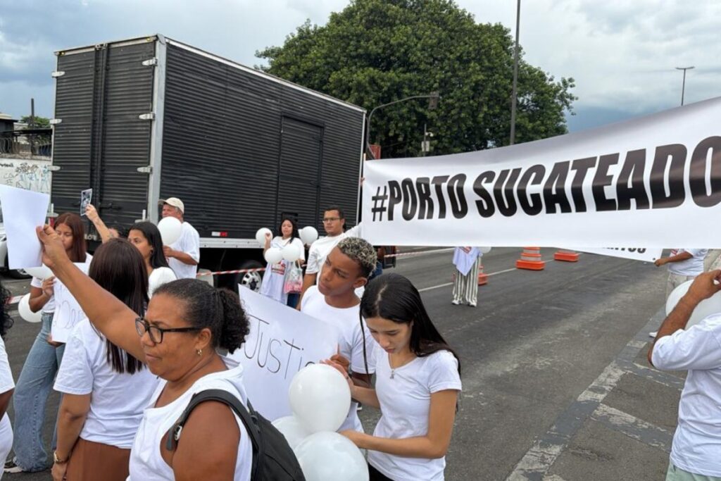 Manifestante levantam faixas cobrando justiça e melhorias no porto Matheus Croce/TV Tribuna A morte da técnica auxiliar Denise dos Santos