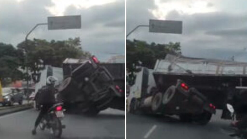 Vídeo mostra momento em que carreta tomba na Avenida Amazonas, em BH Uma carreta tombada há mais de 10 horas