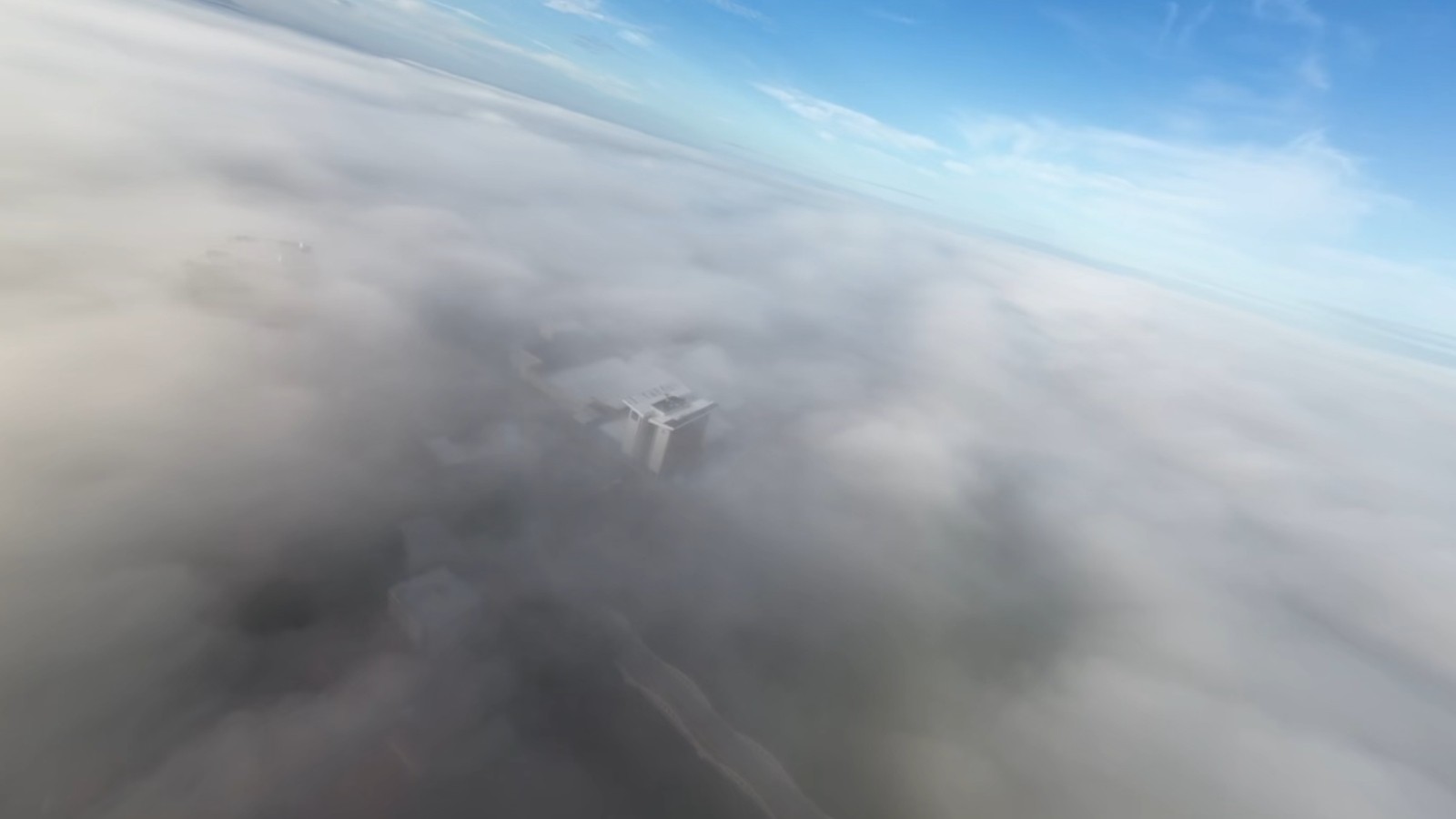 Imagens de drona feita pelo morador Thadeu Vieira mostram ruas parcialmente encobertas pela névoa, com prédios visíveis apenas a curta distância.