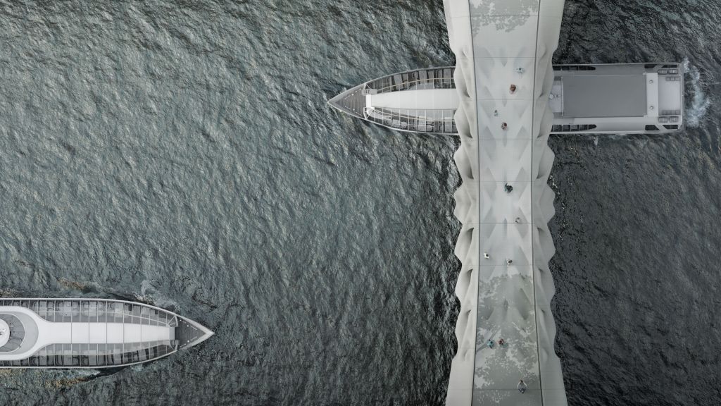 No entanto, após a cidade mudar suas regulamentações sobre novas estruturas de grande escala, a equipe começou a procurar outras vias navegáveis icônicas na Europa. Akbarzadeh fez parceria com o estúdio de design digital Fortes Vision para criar renderizações digitais conceituais que visualizam a ponte sobre o Rio Sena no centro de Paris.