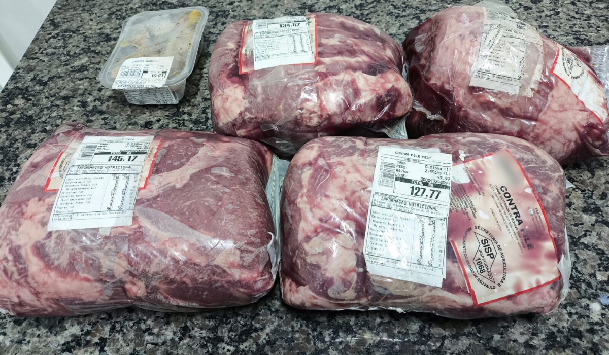 Foram apreendidas três peças de contrafilé (8 kg), uma peça de lagarto (2,3 kg) e linguiça (222 g).