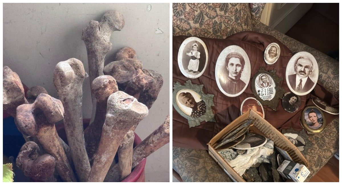 Acionada, a Polícia Militar encontrou, então, 12 crânios e outros ossos humanos guardados em caixas e sacolas. Junto das ossadas, havia fotos antigas em preto e branco de várias pessoas e objetos.