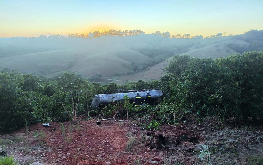 Caminhão-tanque carregado com 15 mil litros de combustível capota em estrada rural de Nova Resende, MG Corpo de Bombeiros/Divulgação O