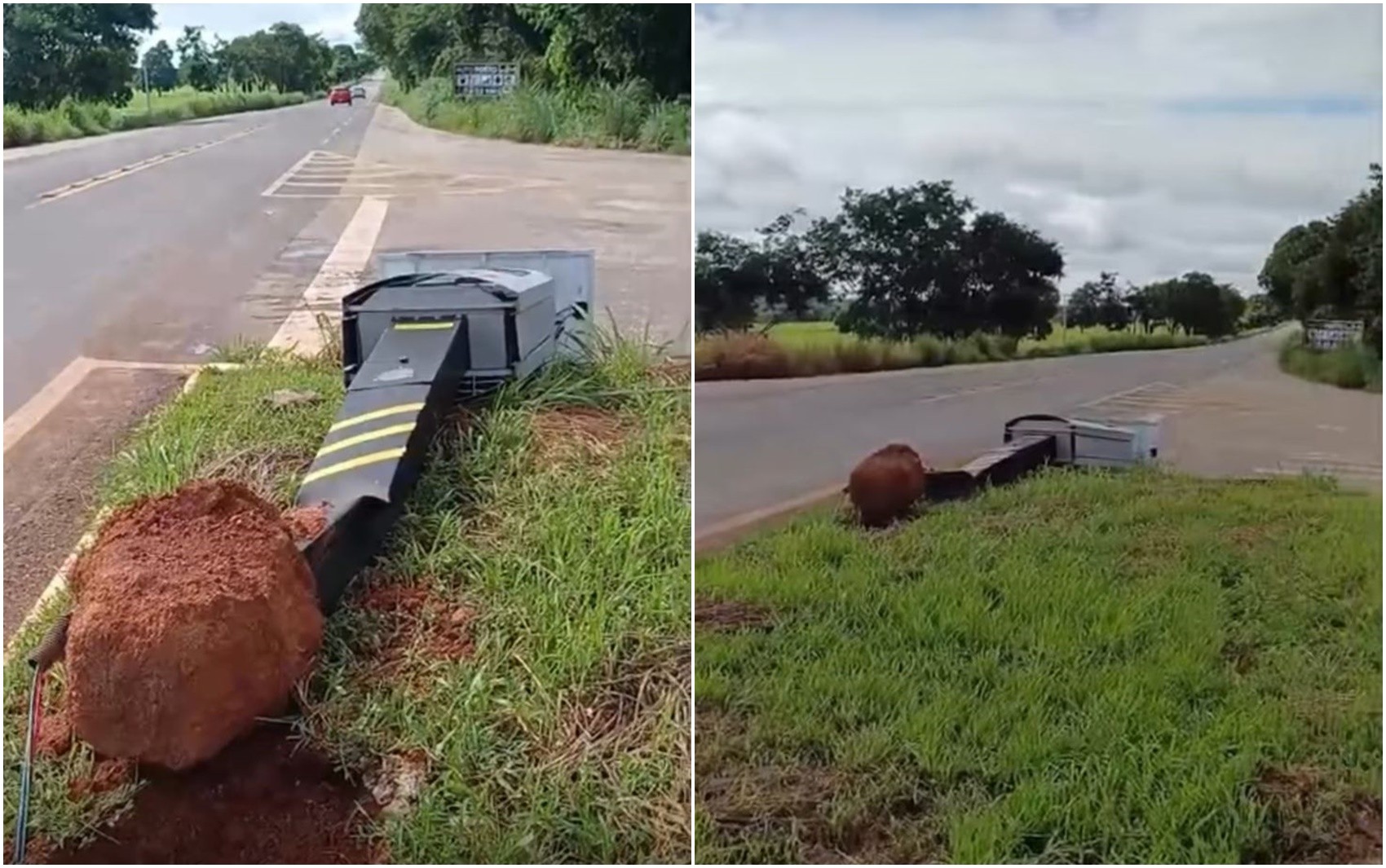Radares de controle de velocidade instalados na GO-164 foram encontrados derrubados na manhã deste sábado (3), no trevo que liga a rodovia à GO-239, conhecido como trevo da Piraíba, em Nova Crixás, na região do Rio Araguaia.