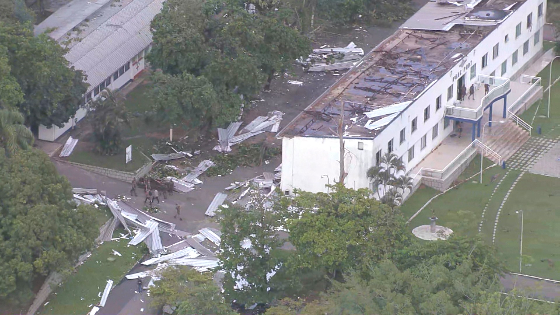 O Globocop sobrevoou bairros atingidos pelo vendaval durante o Bom Dia Rio. Na Vila Militar, o prédio da Artilharia Paraquedista ficou quase sem telhas, e muitas ainda estavam pelo gramado nesta manhã.